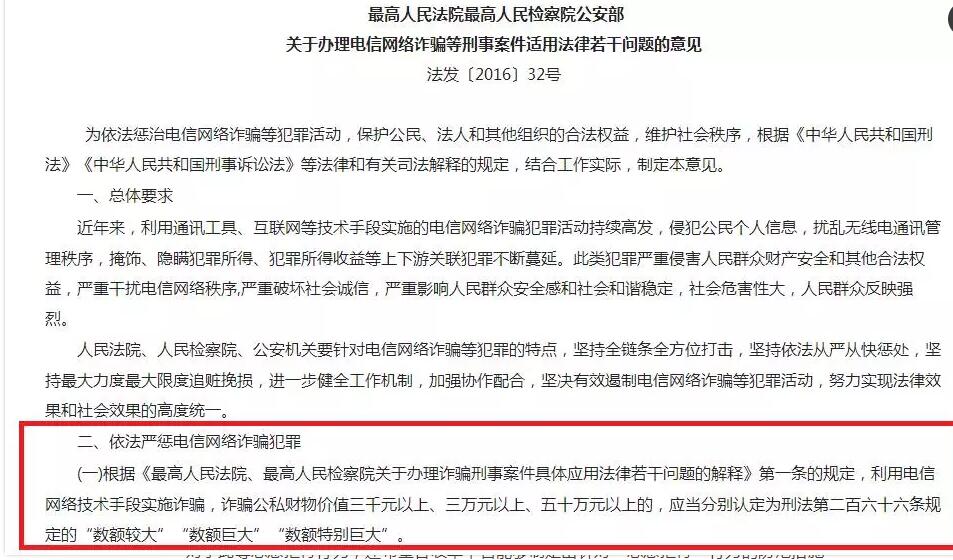 正在看法中明白:操纵电信收集手艺手段实施诈骗,诈骗公私财物价值三千元以上、三万元以上、五十万元以上的,该当别离认定为刑法第二百六十六条的“数额较大”“数额庞大”“数额出格庞大”。这意味着但凡被定性为诈骗行为且诈骗财物价值跨越3000元的就曾经了刑法,属于正儿八经的违法犯为。